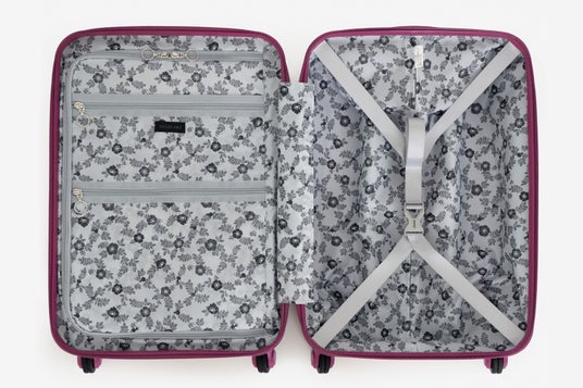 本体トップ側は、床に置きスーツケースを閉じる時にトップ側の荷物が崩れ落ちない仕様で、ファスナーポケットが2つ付いています。ボトム側は荷物を固定できるベルト付き。