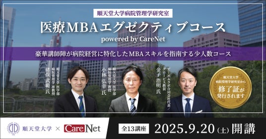 株式会社ケアネット(本社:東京都千代田区、代表取締役社長:藤井勝博。以下「ケアネット」)は、順天堂大学病院管理学研究室(東京都文京区、教授:小林弘幸氏)と共同で、「医療MBAエグゼクティブコース」の第3期(2025年度)受講生募集を開始しました。