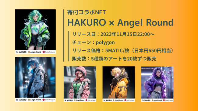 エンジェルラウンド株式会社(本社:東京都豊島区、代表取締役:大越匠)は、AIアートプロジェクト「HAKURO」とコラボNFTを発行します。コラボNFTは全5種、polygonチェーンで5MATICで販売。購入者(ホルダー)にはブロックチェーンを活用したデジタル証明書の発行のほかいくつかの特典を予定しています。コラボNFTの売上は「ともに考え、ともにつくる。」をビジョンに掲げている一般社団法人コード・フォー・ジャパンへ全額寄付します。