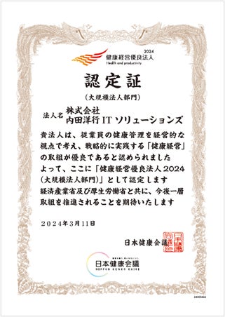 株式会社内田洋行ITソリューションズ(本社:東京都江東区、代表取締役社長:新家 俊英、以下 ITS)は、経済産業省・日本健康会議が主催する「健康経営優良法人2024(大規模法人部門)」に認定されました。今回の認定により、健康経営優良法人認定制度が創設された2016年度より7年連続の認定となります。