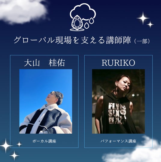 弊社所属アーティスト現場を含めてグローバル基準のステージを支える一流の講師陣が、受講者一人一人に寄り添い、「ボーカル講座」「パフォーマンス講座」のそれぞれから、その人にしかない個性を見つけていく、独自カリキュラムを展開して参ります。