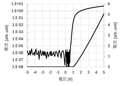 評価の結果、試作したr-GeO2 SBDがダイオード動作することが確認されました(図2)。ON/OFF比は7桁を示しており、良好な整流特性が得られています。また、容量電圧測定(C-V測定)によってN-層のドナー不純物濃度を解析したところ、約1×1017[cm-3]を示すことが確かめられました(図2 右)。
