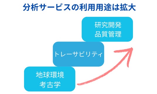 安定同位体分析の用途は年々広がっております。地球環境や考古学に関連した分析のほか、物質の産地判別(トレーサビリティ)を目的とした分析、さらには石油化学製品・天然物や高分子材料の純度評価や異物混入など品質管理、各種研究開発なども増加しております。また、環境負荷低減・脱炭素などをキーワードに、環境に関係する分析ニーズも増えております。
