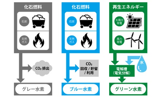 次世代エネルギーとしてさまざまな分野で活用が見込まれる水素ガスですが、その製造方法によりいくつかの種類に分類されます。大きくは「製造時に二酸化炭素を排出しないで生成された水素」と、「製造時に二酸化炭素を排出して生成された水素」です。