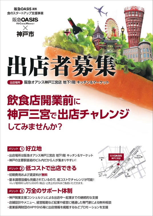 神戸市は、エイチ・ツー・オー・リテイリング(株)と包括連携協定を締結し、食のスタートアップ支援事業として、阪急オアシス神戸三宮店内にチャレンジ場所として一区画を提供し、神戸市内で今後の活躍が見込まれる出店者を募集しています。