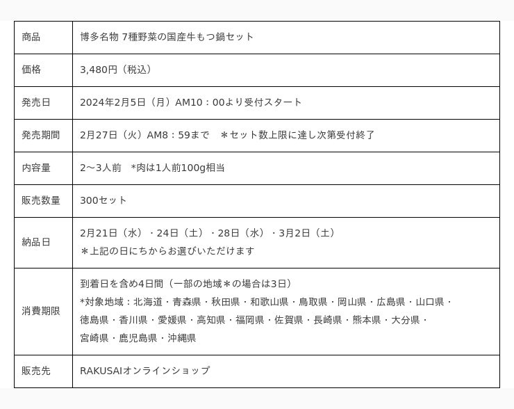 楽彩株式会社(本社:東京都足立区/代表取締役社長:大崎善保)は、2024年2月5日(月)より“博多名物 7種野菜の国産牛もつ鍋セット ”を予約発売いたします。プロの目利きが選んだ7種の厳選野菜が入ったもつ鍋で、今冬の『鍋の食べ納め』としてお楽しみください。