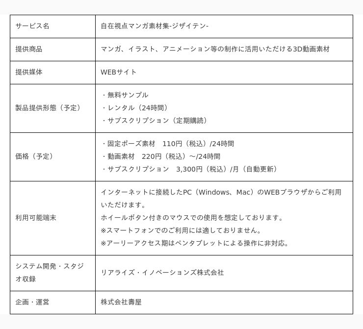 リアライズ・イノベーションズ株式会社(本社:東京都港区、代表取締役社長:酒谷 正人)の提供するボリュメトリックビデオ技術が、株式会社壽屋(本社:東京都立川市/代表取締役社長:清水一行)のクリエイター向けWEBサービス「自在視点マンガ素材集-ジザイテン-」アーリーアクセス版に採用されます。本サービスでは、リアライズ・イノベーションズが提供する高品質なボリュメトリックビデオ技術を用い、イラストレーターやマンガ家などクリエイターに向け3D動画素材を提供いたします。