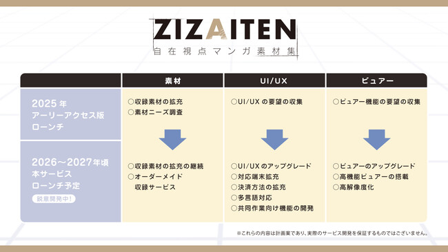 本サービス版は、クリエイターからのEA版フィードバックを経て開発進行を計画。ビュアーの機能やUI/UXを改良し、趣味にも仕事にも使えるサービスを目指します。