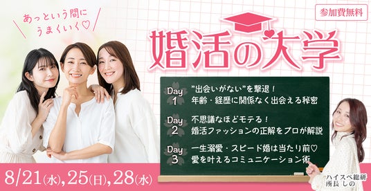 ハイスペ男子総合研究所は8/21(水)・8/25(日)・8/28(水)の3回にわたって無料オンラインイベント「婚活の大学」を開催いたします。アラフォー・アラフィフ・恋愛経験ゼロなど、恋愛・婚活で悩んでいた女性たちがスピード結婚や溺愛婚を叶えた秘密をお伝えします。