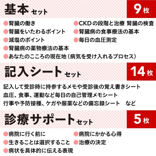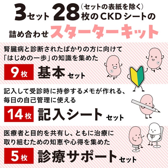 透析をしていない腎臓病の方や腎臓の健康が気になる方に向けて、慢性腎臓病(CKD)の自己管理のしくみ提案の一環として提供している「CKDシート」のよりすぐり、スターターキットの販売を開始しました。