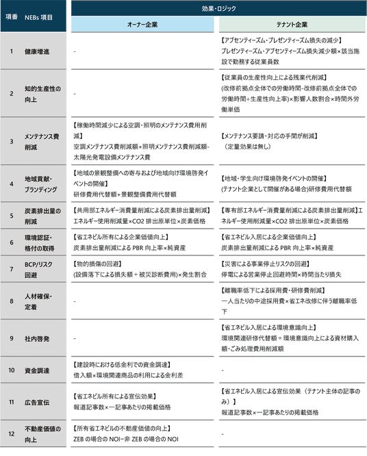 既存の自社所有の事務所ビルを対象としたNEBs12指標をベースに、テナント型のオフィスビルにおいて発現するベネフィットをオーナー企業・テナント企業それぞれについて整理しました。また、それらのベネフィットを定量化するロジックを作成し、整理しました。