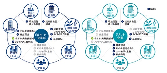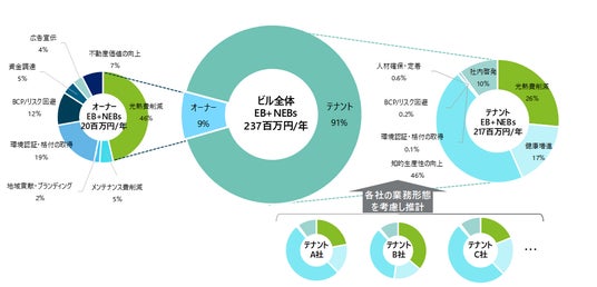 これまでNEBs指標は自社所有のオフィスビルを対象としていましたが、このたびテナント型のオフィスビルを対象に定量化ロジックを作成し、ビルオーナーとテナント企業それぞれに発現するNEBsを算定、ビルオーナー・テナントが省エネに取り組むそれぞれのベネフィットを分けて評価できるようになりました。