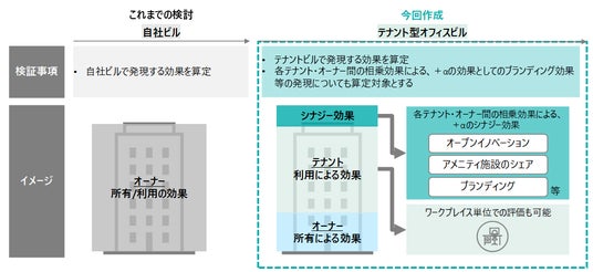 約4万平方メートル のテナント型のオフィスビルをモデルとした場合、オーナー側は年間2,000万円、テナント側は合計年間2.2億円の効果が発現、うちテナント間のシナジーによる効果額は約1,400万円