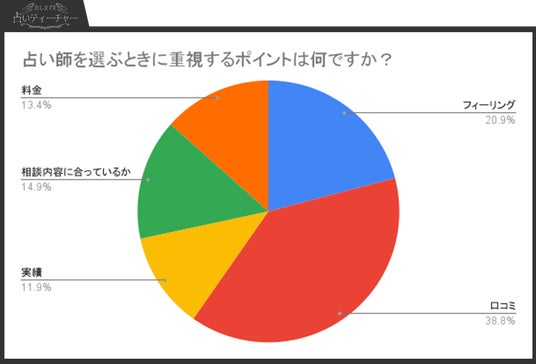アンケート結果では、「口コミ」を重視する人が最も多く(38.8%)、他の利用者の評価や体験談が占い師選びの重要な要素となっていることが分かりました。次いで「フィーリング」(20.9%)が多く、占い師との相性や直感を重視する傾向が見られます。「相談内容に合っているか」(14.9%)や「料金」(13.4%)、「実績」(11.9%)も一定数の支持を集めており、それぞれが選択の基準として重要視されています。