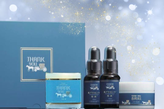 内容:こうね100%生馬油(50g)×6個、サンキュー生馬油石鹸(50g)×6個、馬プラセンタ原液(30ml)×6個