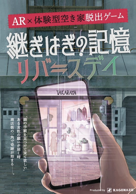 「謎解き×地域活性」をコンセプトに、日本中の地域に謎解きを仕掛け地域活性に貢献するクリエイティブ集団『KAGENAZO(運営:FUN SPIRITS株式会社、本社:東京都港区、代表取締役:日景太郎)』は、名古屋市が主催する、2045年の未来の商店街を妄想し形にする「アイデアコンテスト&実証実験」プログラム「MOSHIMO FUTURE STREET」の事業として、AR×体験型空き家脱出ゲーム『継ぎはぎの記憶 ~リバースデイ~』を2025年2月14日(金)から開催いたします。