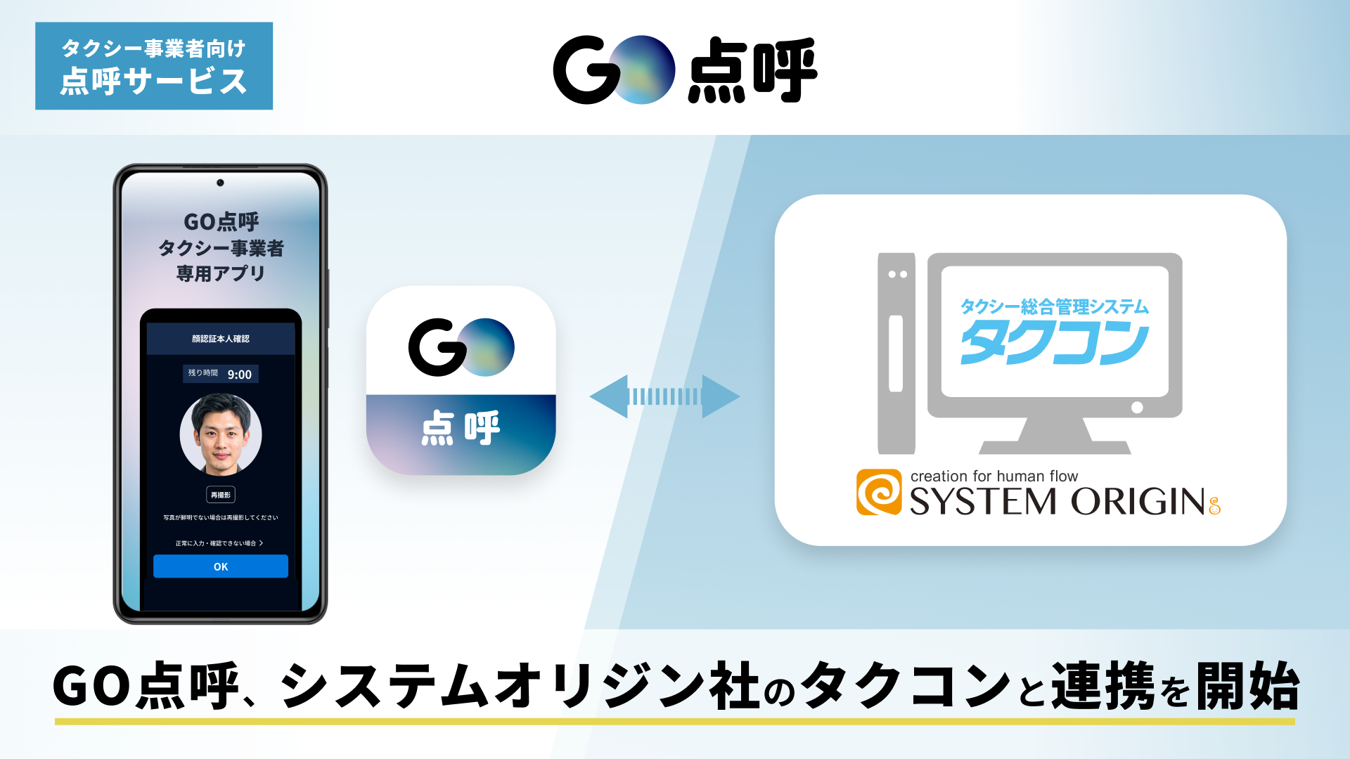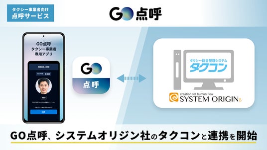 株式会社システムオリジン(本社:静岡県静岡市、代表取締役社長:海野 知之)が展開するタクシー総合管理システム『タクコン』は、GO株式会社(本社:東京都港区、代表取締役社長:中島 宏)が展開する、タクシー事業者向け自動点呼システム『GO点呼』と2026年1月26日(月)よりシステム連携を開始します。これにより、『GO点呼』側へのシフト入力や『タクコン』への点呼記録入力が自動化され、効率的な運行管理が可能となります。