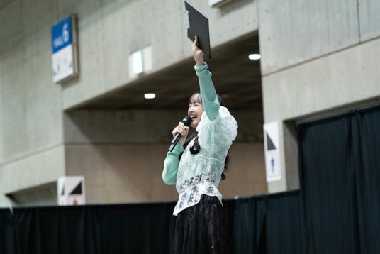 本日 3 月 20 日(水・祝)、STU48 が 10th シングル「君は何を後悔するのか?」劇場盤発売記念イベント 直接会ってお話しができ る!「個別お話し会」&「2 ショット写真会」を幕張メッセで開催。 会場に設置されたステージに副キャプテンの福田朱里が登場し、「皆さん、お話し会楽しんでますかー?」と呼びかけると、お知らせコー ナーがスタート。