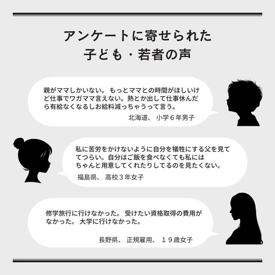 子どもの貧困対策に取り組んでいる公益財団法人あすのば(事務所:東京都港区 代表理事:小河光治)は、あすのばが実施している「入学・新生活応援給付金」などを受給した全国の生活保護世帯・住民税非課税世帯などの子ども・若者(小学4年生~20代半ば)と保護者6千人調査の最終報告会を11月13日(水)19時からオンラインで開催します(分析協力:三菱UFJリサーチ&コンサルティング株式会社)。