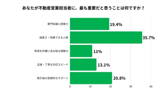 不動産営業担当者に求めるポイントを尋ねたところ、全世代共通で1位となったのは「誠実さ・信頼できる人柄(35.7%)」でした。不動産取引のように高額かつ専門性の高い意思決定では、“誰に任せるか”が最重要であることが再確認される結果となりました。続いて、2位「取引後の長期的なサポート(20.8%)」、3位「専門知識と提案力(19.4%)」が上位を占めました。