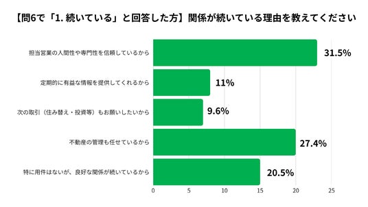取引後も営業担当との関係が続いていると回答した人は13.4%に留まり、不動産取引が“一度きりの関係”で終わるケースが大半であることが明らかになりました。