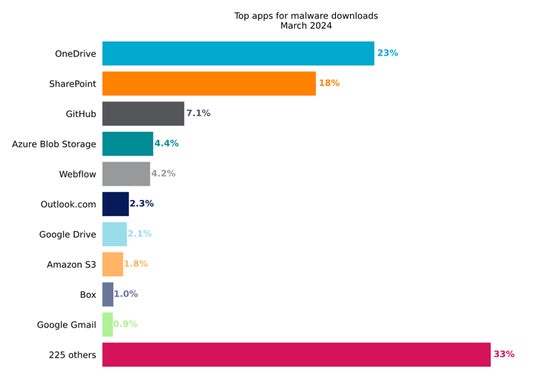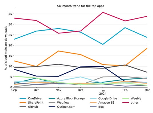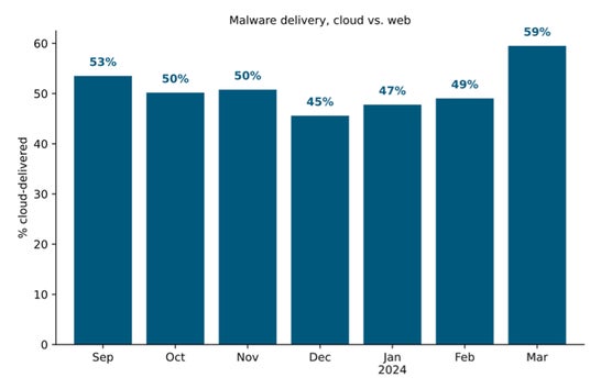 攻撃者は、一般的なクラウドアプリを介して悪意あるコンテンツを配信することで、検知を回避しようと試みています。マルウェアの配信にクラウドアプリを悪用することにより、主にドメインブロックリストや、URLフィルタリングに依存するセキュリティ制御、クラウドトラフィックを検査しないセキュリティ制御の回避が可能になります。2024年3月、HTTP/HTTPSマルウェアのダウンロード全体の59%は、一般的なクラウドアプリから配信されました。
