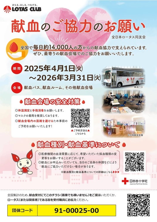 創立50周年を機に今までの活動をふまえ、日本赤十字社様ご協力の下、2025年4月から1年間、ロータスから日本全国に献血の輪を広げるきっかけづくりとして「献血活動の推進」を行います。