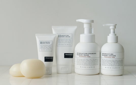 洗うアイテムは、固形石けんの「モイスチャーベビーソープ」と、ポンプ式の「モイスチャーフォーミングベビーウォッシュ」の2種類をご用意しました。乳幼児用の洗浄料には弱酸性が多いなか、マークスアンドウェブでは、汗や皮脂、よだれなど、弱酸性傾向にある汚れをきちんと落として清潔に保つことを重視し、弱アルカリ性の処方を採用しています。石けんベースのため、泡切れがよくすすぎに時間がかからないのも特長です。