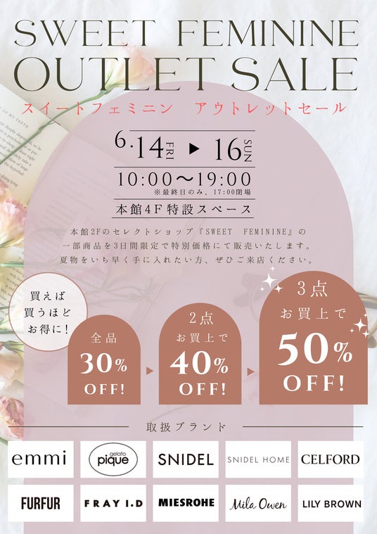 THREE本館2Fのセレクトショップ『SWEET FEMININE(スイートフェミニン)』が、初めてのアウトレットセールを開催。最大50%OFFとなるお得な3日間をぜひお楽しみください。