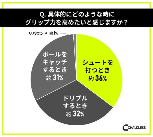 バスケットボール経験者の中でグリップ力や滑りにくさを高めたいと感じるシーンとしてシュートを打つときと答えた人が約36%、ドリブルをするときと答えた人が約32%、ボールをキャッチするときと答えた人が約31%いました。キャッチの延長線でリバウンドの瞬間と答えた人もいました。
