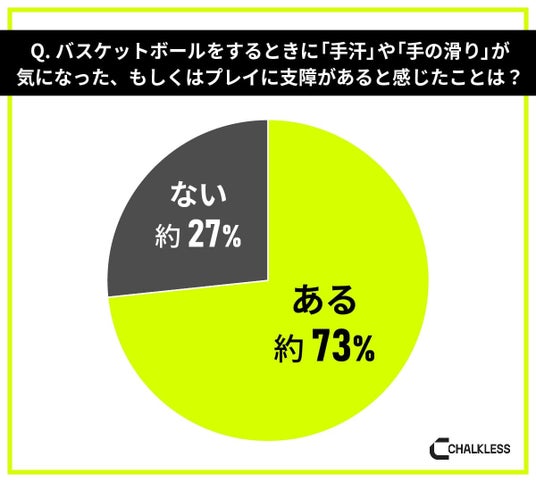 バスケットボールの最中に手汗や滑りが気になった人は約73%と高い割合で手汗や滑りに関する悩みや課題感を持つ人がいることがわかりました。