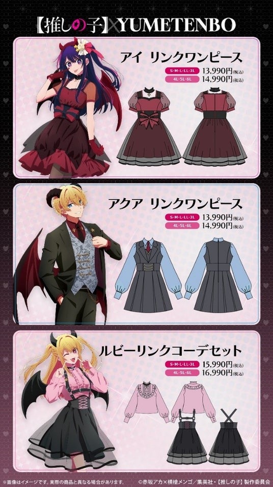 夢展望とのコラボレーションにおいては、「Black Devil Stars」をテーマに、【推しの子】の主な登場人物が着用する小悪魔的な要素を加えたスペシャルな限定ワンピース6点を用意しました。幅広い世代から支持される【推しの子】ファンの皆様に、「#推しとリンク」できるかわいいアイテムとして、先行受注は大変好評いただき、終了いたしました。