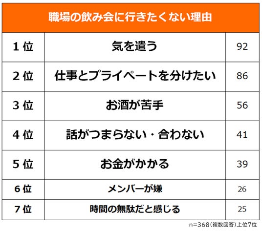 節約しているからお金を使いたくないという人もいるでしょう。アンケート結果からは「おもしろくもない飲み会にお金を使うのは無駄」という思いが見て取れました。