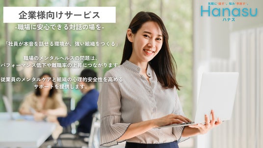 「Hanasu ハナス」は、臨床心理士・公認心理師によるオンラインカウンセリングからはじまる"オールインワン"のメンタルヘルスケアを通じて、個人のメンタルケアと組織改善の両方を支援する新しいメンタルヘルスサービスです。