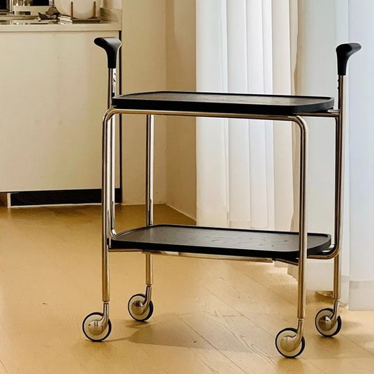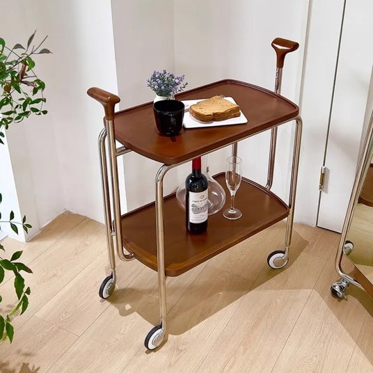 ステンレスと木材を組み合わせたスタイリッシュなアイテム。木製のハンドルで持ち運びも簡単にでき、どんなお部屋にも調和するデザインが魅力です。静音キャスターが付いているため、移動がスムーズで音も静か。ワゴンとしてはもちろん、収納やサイドテーブルとして多用途に使用できる便利な優れもの。