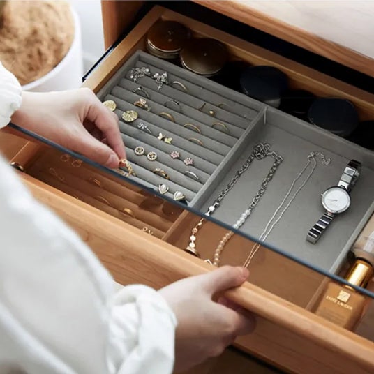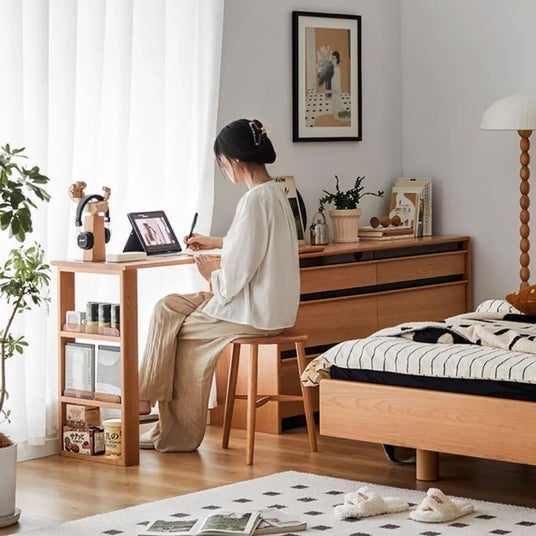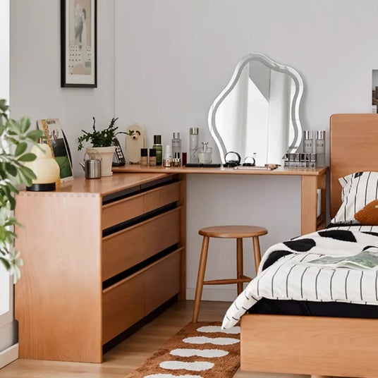 美しいチェリー材を使用した、シンプルで洗練されたデザインのドレッサーデスク。天板は左右どちらにも設置できるため、レイアウトを自由に変更でき、スペースに合わせた使い方が可能です。チェスト付きなので収納力もあり、化粧品、アクセサリーや洋服などをスッキリと整理整頓!