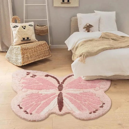 優しい柔らかな素材を使用し、蝶のデザインが特徴的な愛らしいラグ。洗濯可能なので、清潔に保てるのも嬉しいポイント。裏面には滑り止め加工が施されており、安心して使用できます。お部屋の雰囲気を明るく彩る、実用性とデザイン性を兼ね備えたワンアイテムです。