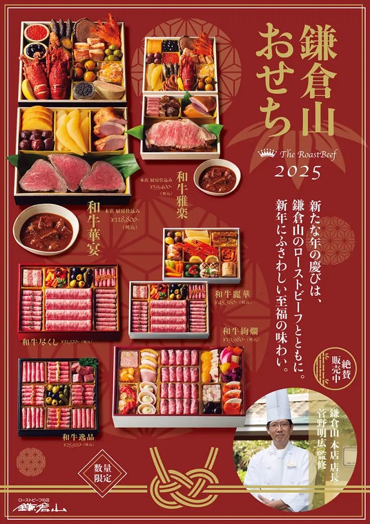 鎌倉山のスペシャリテである「ローストビーフ」にこだわり抜いた、他に類を見ない独創的なおせちのラインナップを絶賛販売中です。和牛尽くしの贅沢な味わいを詰め込んだおせちは、鎌倉山のこだわりと技が結集した特別な一品です。