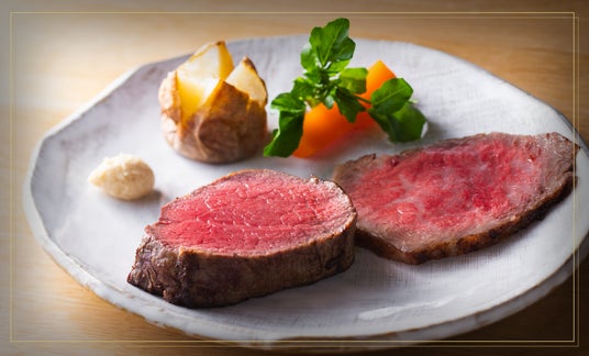 ディナーの締めくくりにふさわしい一皿。希少なヒレ肉と旨み豊かなロース肉を絶妙な火入れで仕上げたローストビーフが、贅沢な余韻を残します。