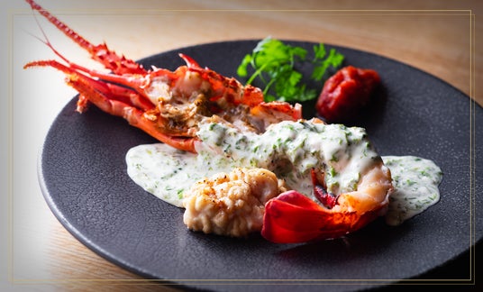 - 芳醇な生海苔クリームが引き立てる、伊勢海老と白子の贅沢な味わい。海の恵みを堪能する至福のひととき。 -