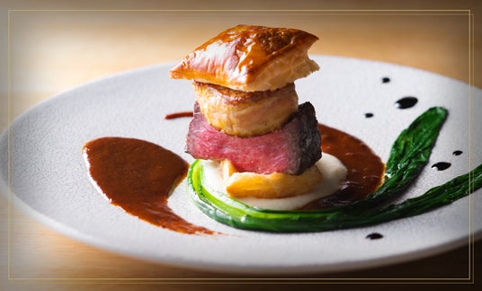 フォアグラと和牛を層に重ねたミルフィーユ仕立て。芳醇なバルサミコと濃厚なデミグラスが織りなす、絶妙なハーモニーをご堪能ください。