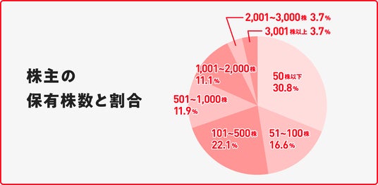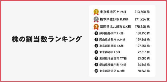 50株以下の保有者が30.8%を占め、初期利用者のようなライトユーザー層でも参加しやすい仕組みとなっていることがうかがえます。一方で、3,001株以上を保有する株主も3.7%存在しており、サービスを積極的に利用することで、多くの株式を保有する株主も誕生しています。なお、最多の割当数は213,600株、上位10名の合計保有株数は1,267,361株となりました。