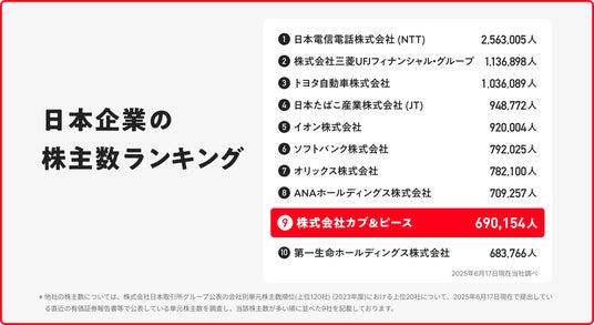 今回の株式の割当てにより、カブ&ピース社の株主数は690,154人となり、日本企業の中で第9位にランクインしました。日本初(*2)の試みでありながら、サービス開始からわずか半年という短期間で、これほど多くの株主が誕生したことは、大きな成果です。