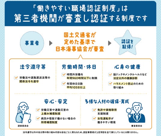 正式名称は運転者職場環境良好度認証制度。国土交通省により創設されたトラック、バス、タクシードライバーの“働きやすさ”を認証マークで「見える化」する制度です。求職者の運転者への就職を促進し、運送事業者の人材確保の取り組みを後押しすることを目的としています。