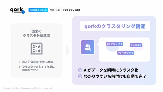 株式会社Quest Research(本社:東京都港区、代表取締役:南健太)は、生成AIを活用したインタビューサービス「qork(コルク)」に、新たにAIチャットベースのクラスタリング分析機能を追加したことをお知らせします。