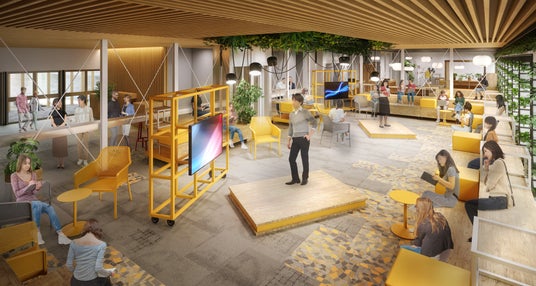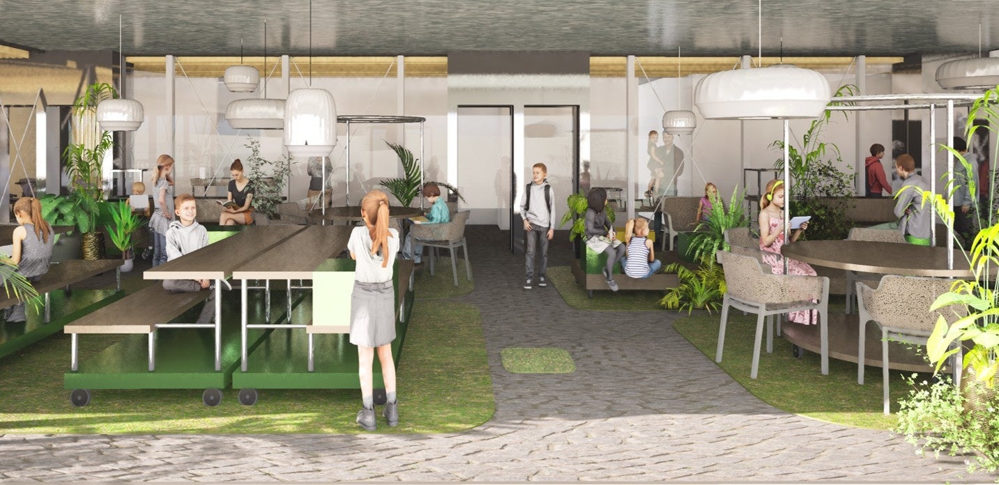 従来の「教室」という概念にとらわれない、社会とつながるための実践的なゾーンを配置しました。