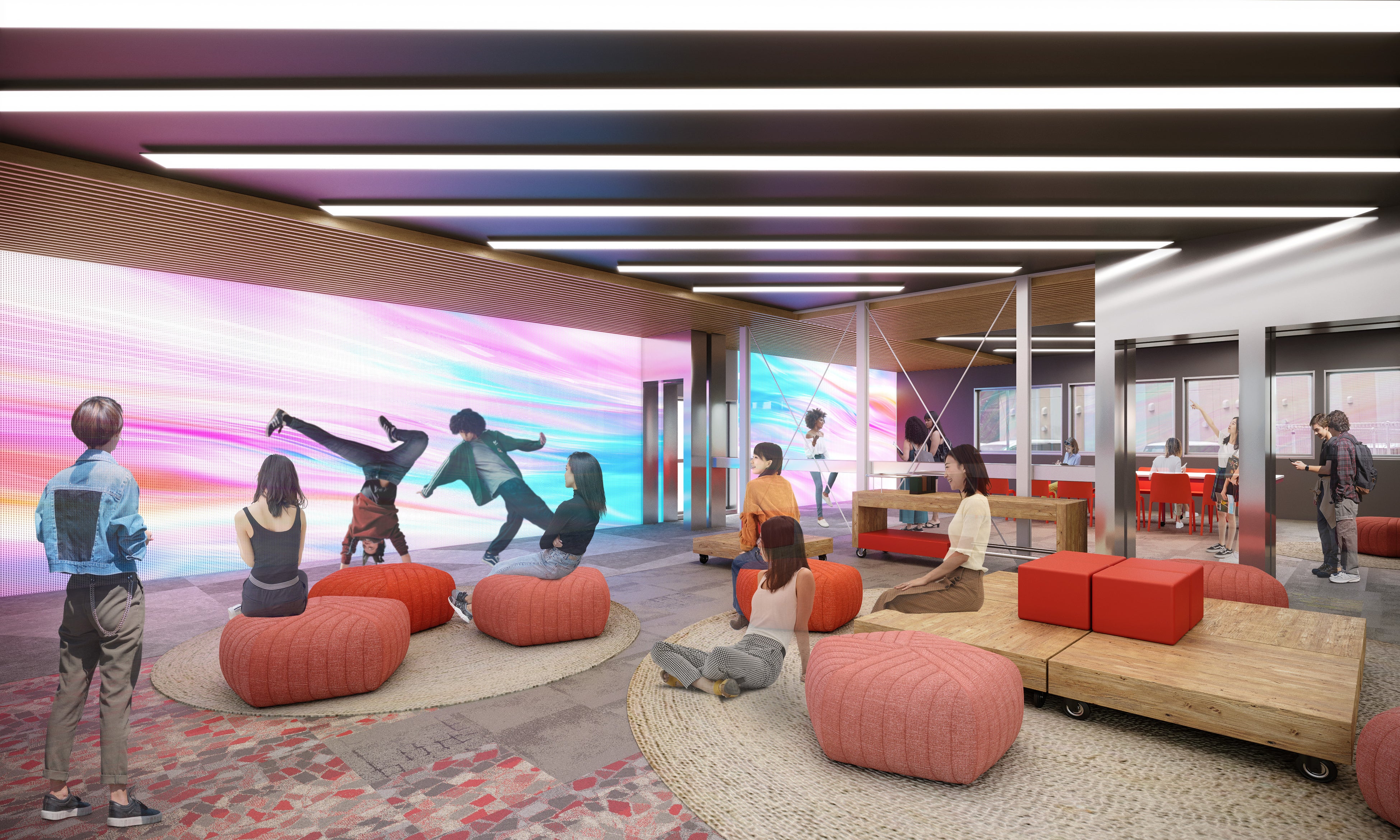 FINDER STUDIO:壁一面に大型LEDビジョンを配した、プロ仕様のクリエイティブスタジオです。ダンスや演劇のパフォーマンス、映像制作、オンライン配信など、デジタルデバイスを駆使した表現活動が可能。保護者向け説明会や産学連携イベントなど、社会に向けたアウトプットの場としても機能します。