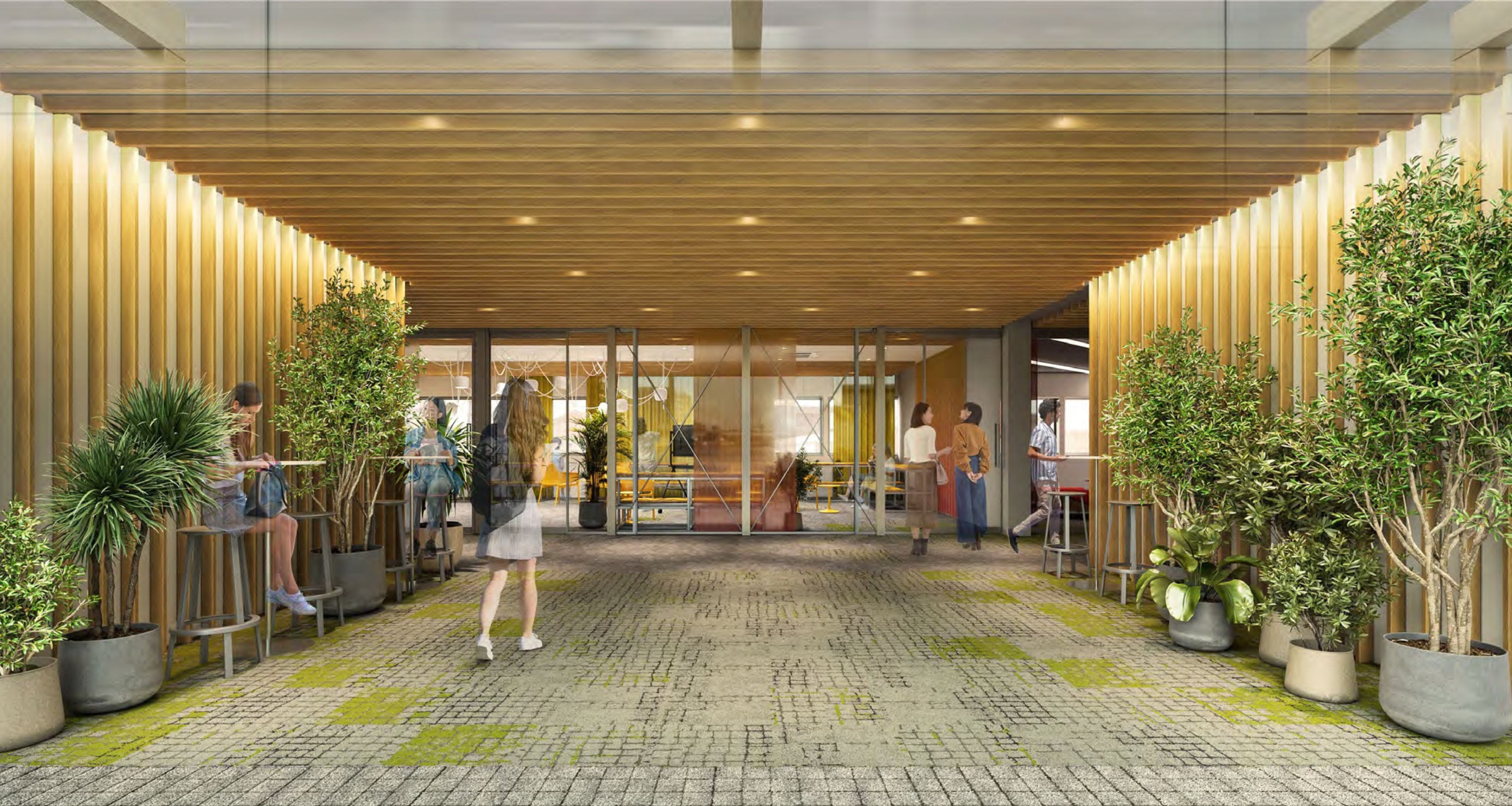 FINDER GATE:朝日が差し込むパーゴラ型ゲートが象徴的なエントランス。登校を「始動・出発」として演出