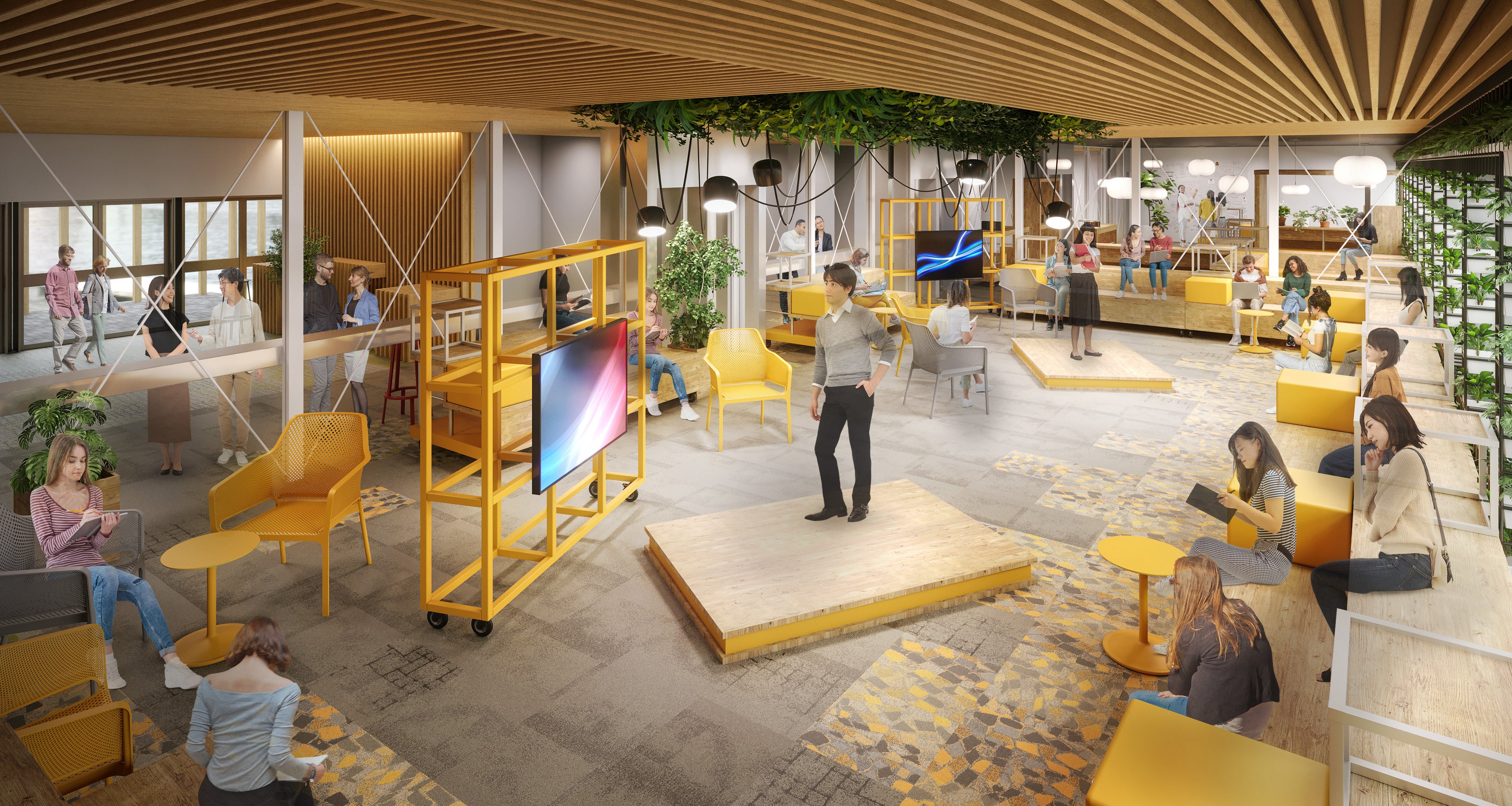 FINDER PARK:公園のように自由な発想で過ごせるラウンジスペースです。可動式の家具を組み合わせることで、グループワークや放課後の自習、生徒同士の語らいなど、目的のない余白の時間から偶発的なコミュニケーションを生み出します。