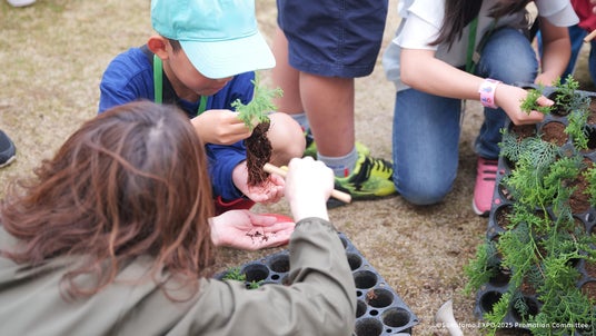 未来の森づくりに参加いただく「植林体験」では、約1万人を超える方々に体験いただきました。ここで植えられた約1万本の苗木は、これから長い年月をかけて育ち、人々の想いと共に未来を支える森「いのちの森」へと成長します。数十年後、数百年後、成長した森のいのちたちが次の世代に出会い、また次の未来へと託されていく。時と共に年輪を重ねるように、今回の住友館の植林体験が、やがて大きな希望の連鎖となっていくことを願っています。